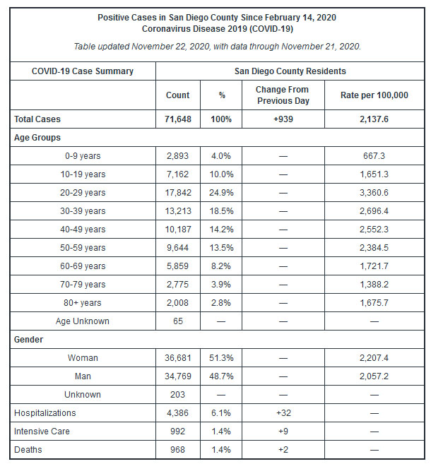 圣地亚哥卫生和公共服务机构官员11月22日报告了939例新的COVID-19感染和2例新死亡,报告了20251例检测结果,阳性率为5%,14天的阳性检测滚动平均值为4.9%。