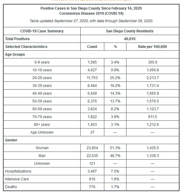 圣地亚哥县卫生部门9月27日下午报告了本县279例冠状病毒病例,一例死亡(一名70多岁的妇女,有潜在疾病)。收到的8550份化验结果中,有3.3%呈阳性,而14天的阳性化验滚动平均数仍为3.3%。