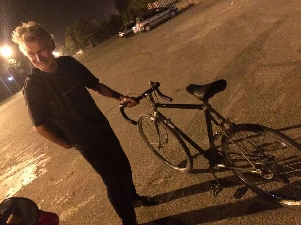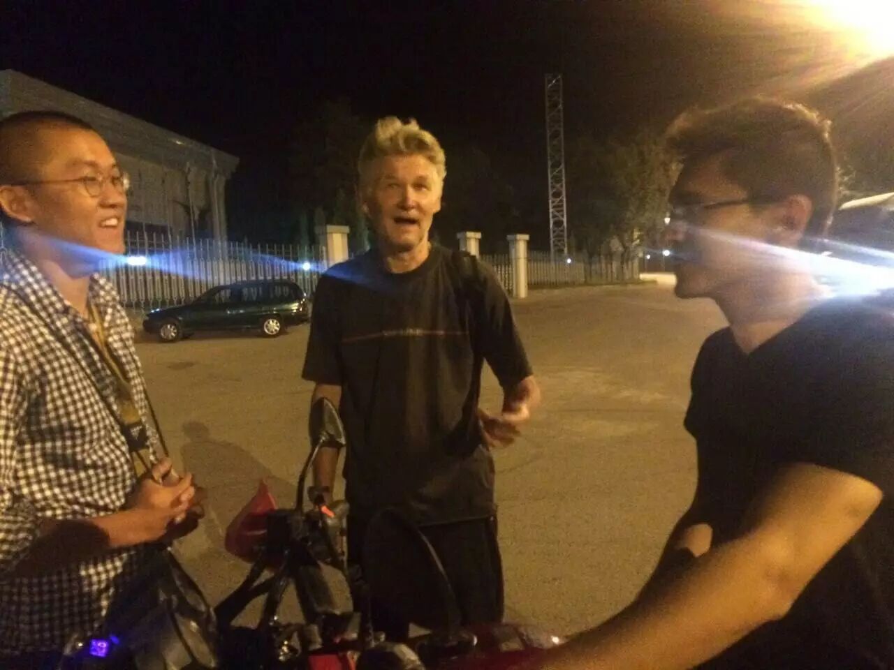 后来在同一天晚上我们在城市另一个角落教我们另外一个朋友 Sher 骑摩托车时,他刚好在骑自行车锻炼,在黑暗中识出我们,过来打招呼。听说我们要去乌兹别克斯坦和非洲,马上就看我们的散热器,然后叫我们一定要去他家,他要帮我们改装车子,在前面加上小风扇,把烧水壶切成铁片然后把片片焊到发动机上来散热。我觉得很有趣,所以临走的前一天晚上去他拜访了他。