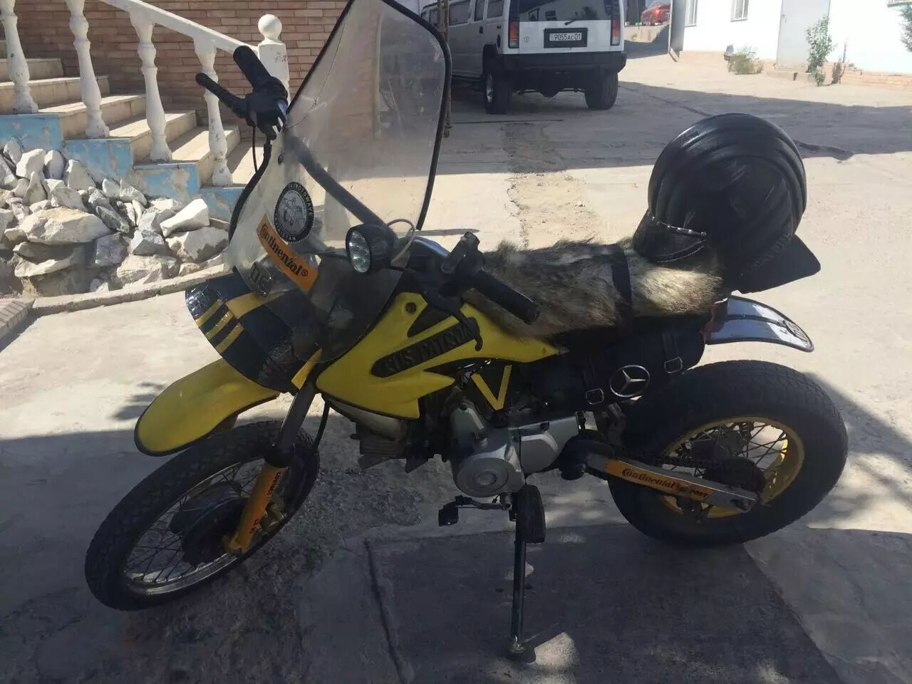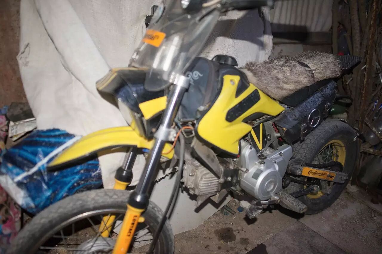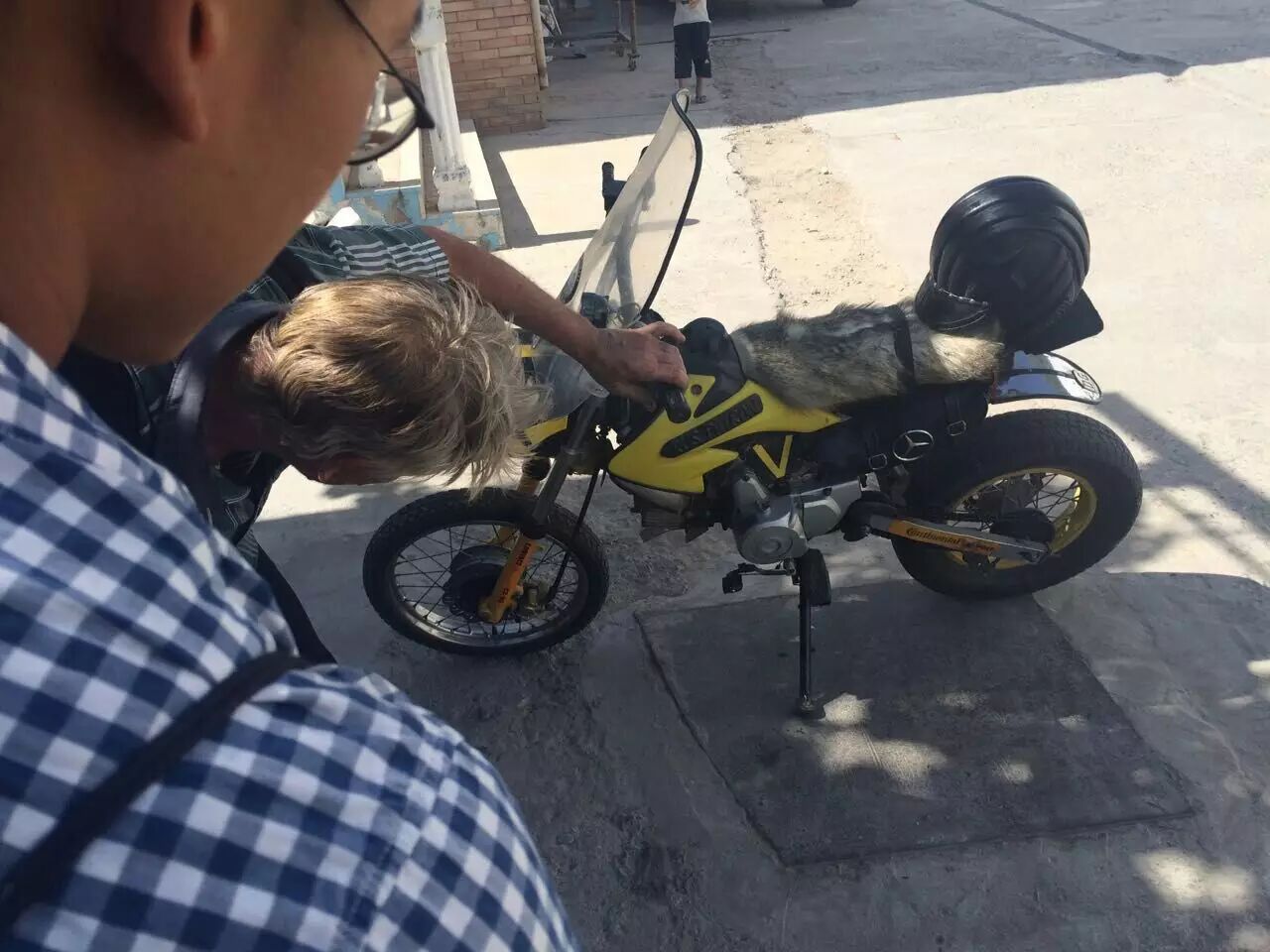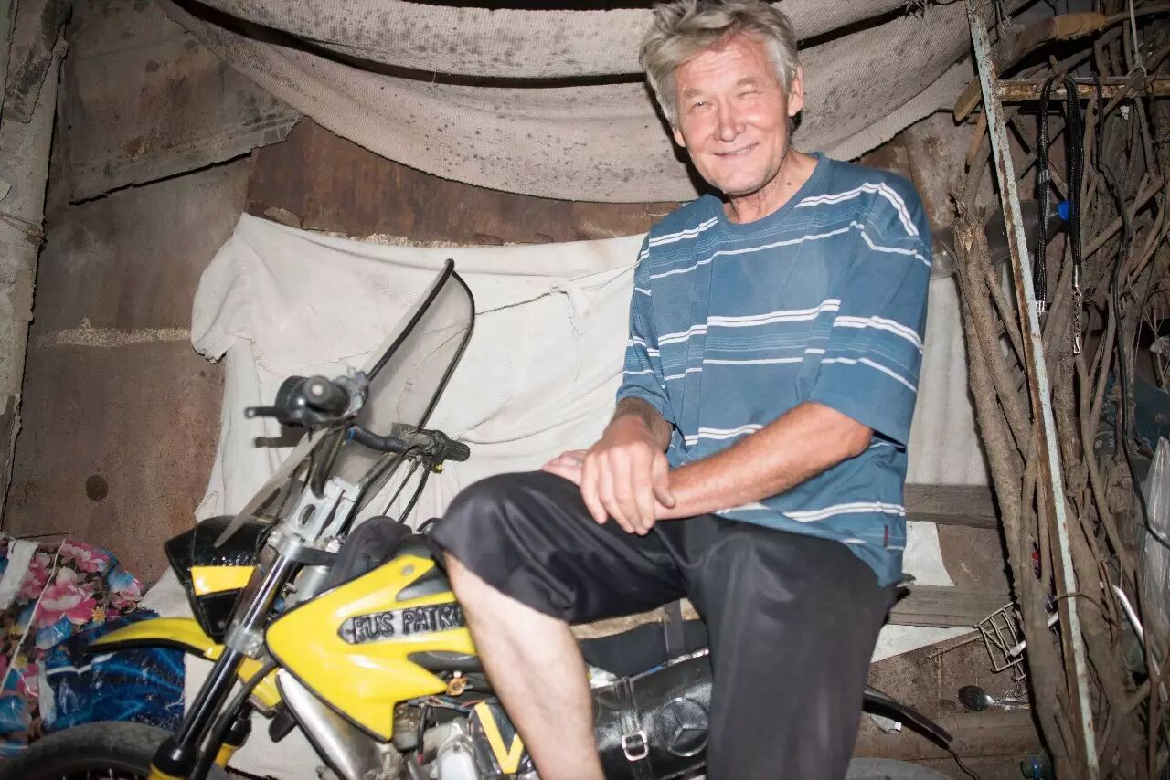 Sasha 满头长长的白发,眼角深深的鱼尾纹,但是从他的言行举止中完全感觉不出他已经 62 岁了。第一次见到他是在杜尚别唯一的摩托车俱乐部,当时他骑着一辆自己组装的小越野摩托车(起的名字叫 Ублюдок / Bastard,意思是私生子)从车上跳下以后满脸笑容地过来跟我们打招呼。