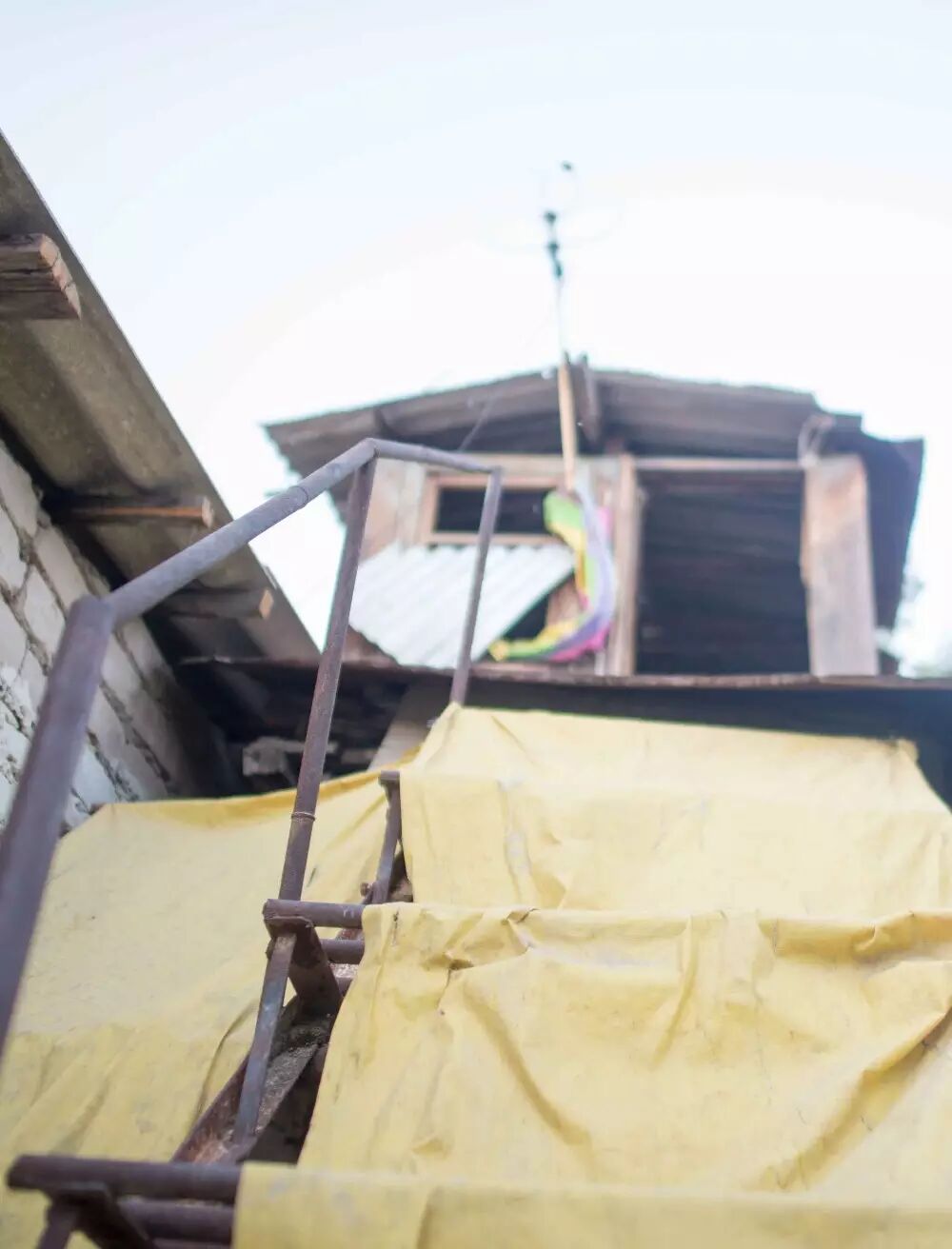 自己搭建的三楼。由于夏天热,他用黄色的尼龙布盖住楼梯挡太阳