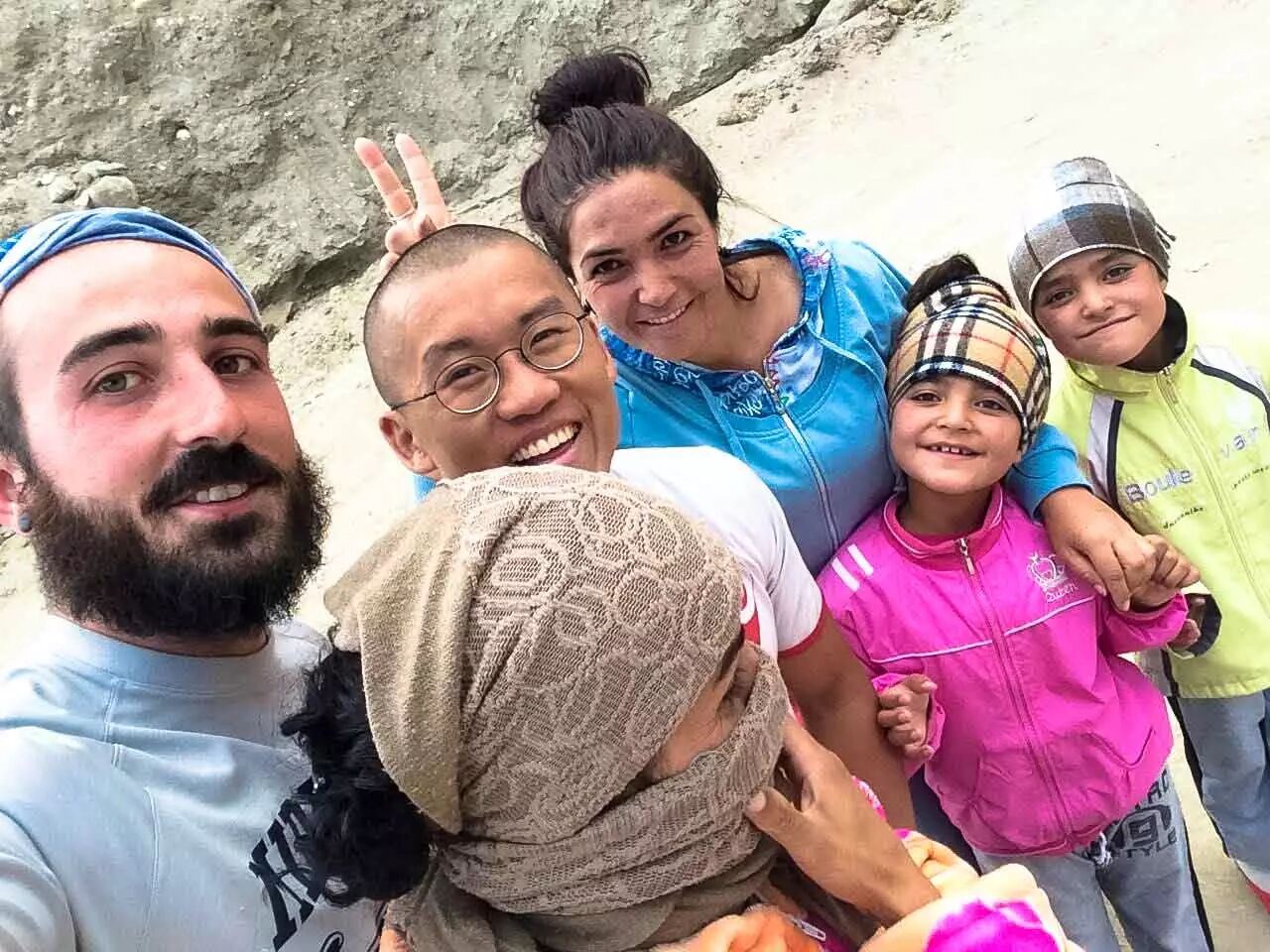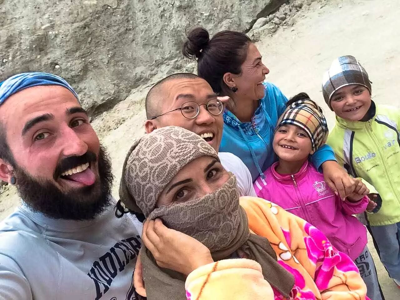 由于北边的路大部分都是柏油路,游客一般都从北边道路穿过塔吉克斯坦,很少会来南边充满烂路的 Wakhan Valley。我们其实一开始也是打算从北边走的,但是现在回想一下,我们都非常高兴最终走了南边,而且如果让我们再次选择的话,一定会再选南边。这里的人可能很少遇到自驾游的游客,所以看到我们都感觉很新鲜、很开心。路过的每个村子的每个小孩子都会兴奋地上蹦下跳、拼命地跟我们挥手,说 “HELLO!”(我用英文地大写是因为他们真的是撕破了嗓门地喊出来的)。胆子大点的孩子从远处听到我们排气管的声音后,会从路边的山坡上跑下来把手伸出来要跟我们拍手。但看到这些孩子的时候我们有时候来不及减速,只能以每小时 50 公里的速度跟他们拍手。有个 10 岁左右的孩子跟在前面行驶的启睿拍完手后痛得把手握在胸前不停地原地打转,但是看到我以后又满脸笑容地还要再拍手。