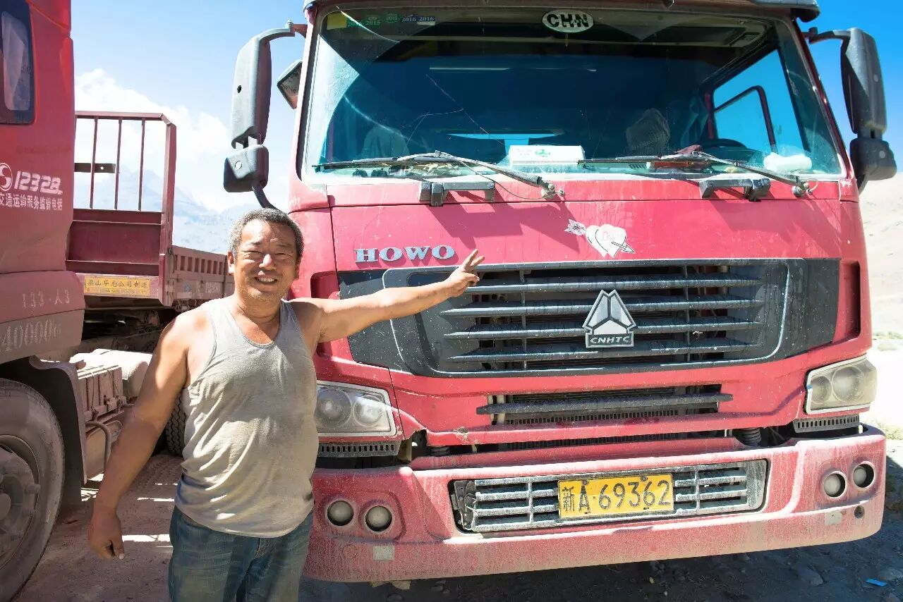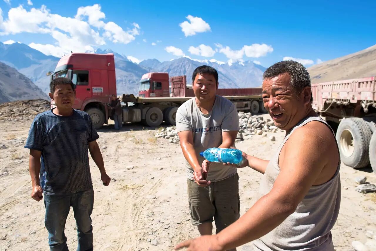 第二波是常年跑长途的物流车队。从远处看到几辆停在山顶的卡车上挂着黄色的中国车牌时我们非常兴奋、感觉非常亲切,把摩托车停好以后就过去跟他们打招呼。他们一开始没有反应过来,没想到会有陌生人在这么偏的地方跟他们用中文打招呼。