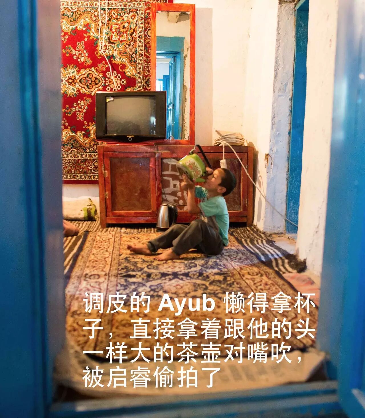 所有的孩子的脸型和眼睛都跟他的一摸一样,鼻子像他们妈妈。大儿子 Akhmal (Ахмал) 是个很乖的、害羞的孩子,一开始他一直坐在 Borye 旁边好奇地看着我们但不敢说话。后来他跟启睿玩得熟了以后开始对启睿打开心门,用俄语告诉他很多东西(可惜的是启睿不会俄语所以没有听懂)。小儿子 Ayub (Аюб) 是个调皮鬼,不管做什么事都会带上家里的小猫-不是把它当泰迪熊一样使劲地抱在胸前,就是拿着小猫的两个前腿然后往上扔。有时候他甚至会直接把小猫扔出去,让它飞出去然后自己着落。Ayub 经常东跑西窜,在客厅坐了几分钟就不耐烦了,会消失几分钟然后再回来。