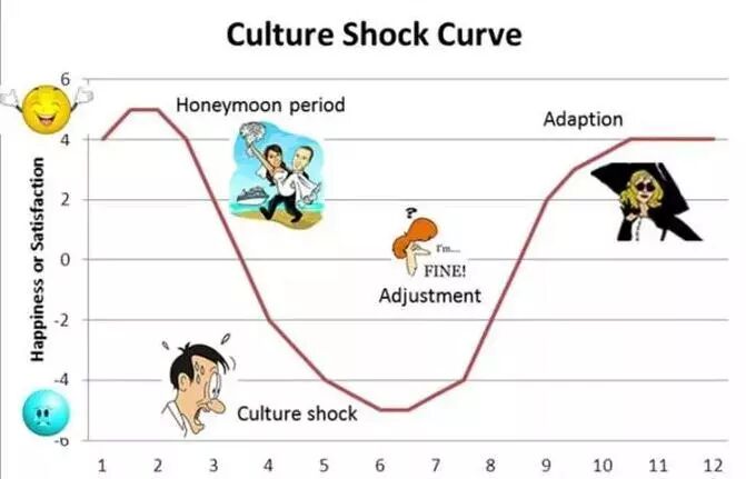 文化冲击是有规律的。开始如同蜜月,初来乍到一个新环境,一切都是新鲜的,充满新奇的感觉。可是好景不长,在你还没有充分享受到新婚的幸福时,蜜月就被生活上的一地鸡毛打破了。