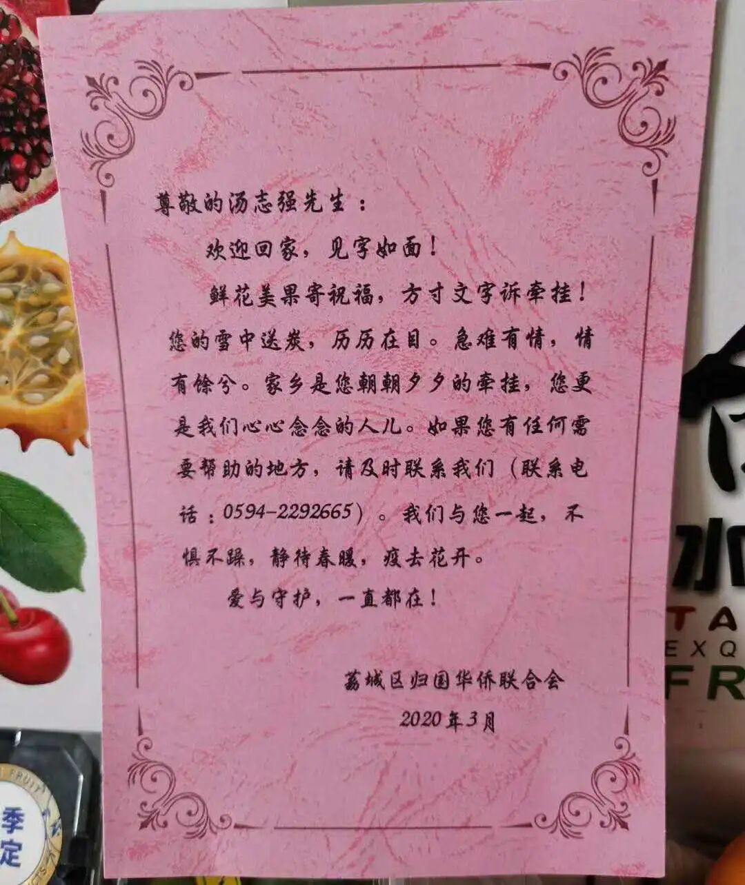 荔城区侨联写给隔离侨胞的一封信。(受访者供图)