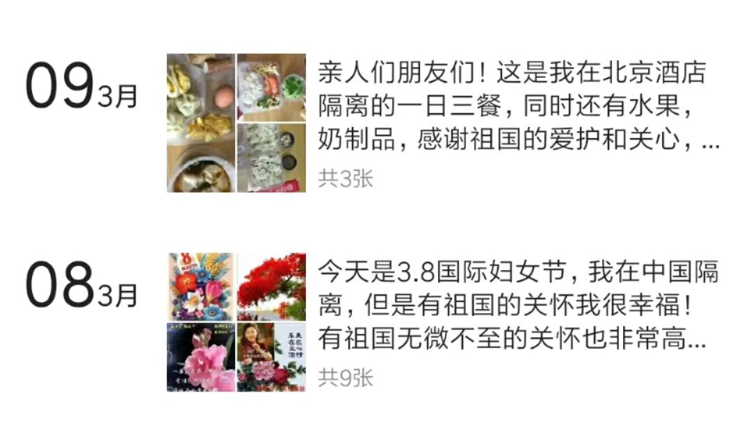 汤志强说,隔离点的食宿条件都不错,工作人员每天来给自己量两次体温。隔离的第二天他接到了好几个电话,是当地的外事办、派出所、社区打来慰问和登记信息的。“家乡的防疫工作做得很细致,对我们的关怀也很到位,让我感觉很温暖。”