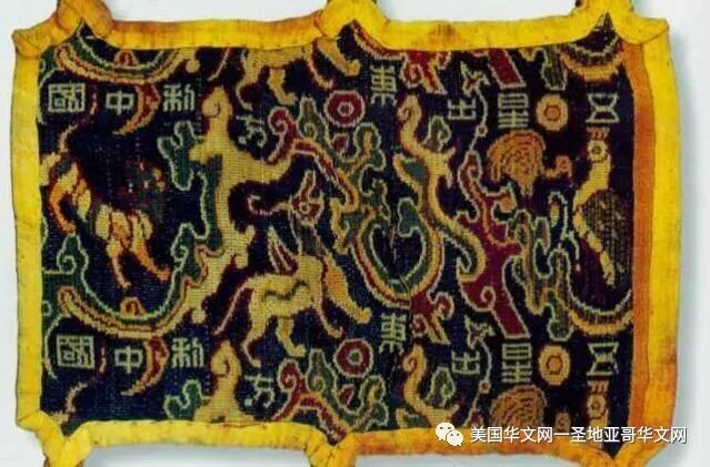 “五星出东方利中国”锦护臂 是另一件令人叹为观止的镇馆之宝。”五星出东方利中国”锦护臂,是汉代蜀地织锦护臂,1995年10月,中日尼雅遗址学术考察队成员在新疆和田地区和布克赛尔县尼雅遗址一处古墓中发现该织锦。锦护臂呈圆角长方形,长18.5厘米,宽12.5厘米,系带长21厘米。以红、黄、蓝、白、绿五色丝线绣制而成,从右至左分别绣有孔雀、仙鹤、辟邪、虎这些瑞兽,在护臂的上方和下方分别用汉隶绣着八个字”五星出东方利中国”。